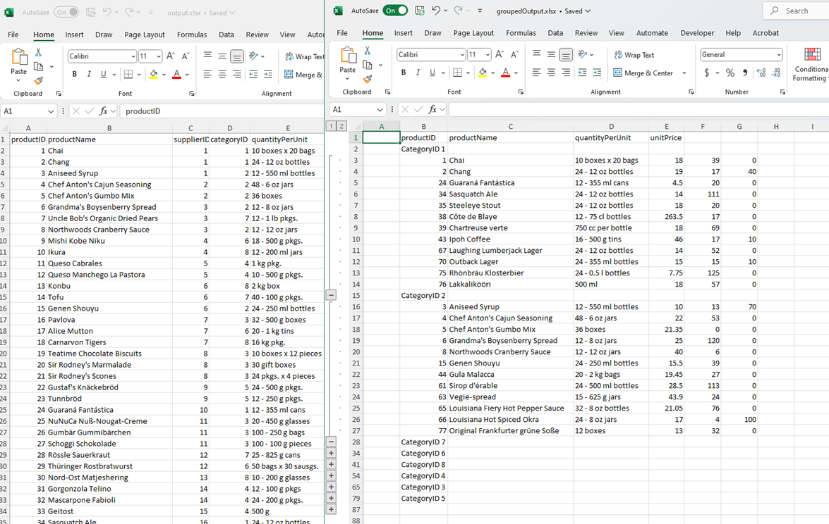Once you have the grouped data, the SpreadProcessing functionality (in a similar way to MS Excel) allows you to assign the outline level to all rows that belong to the same group. To make it clear and simple, let's take the following example - a flat list of products stored in CSV data: