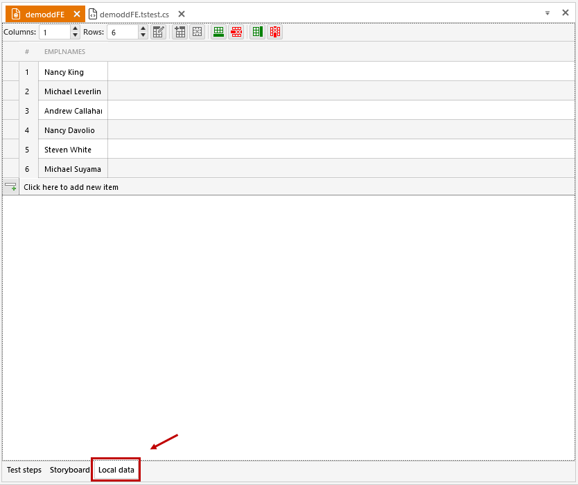 // Get current iteration value from data source var dataIterVal = Data["EmplNames"]; // Define a string which adds the value taken from data source as inner text for the find expression string defForFE = "InnerText="+dataIterVal.ToString(); // Search for the list item element using find expression with the help of the defined string value HtmlListItem nameToSelect = Find.ByExpression<HtmlListItem>("class=k-list-item", defForFE ); Assert.IsNotNull(nameToSelect); // Click the corresponding item from list nameToSelect.MouseClick(ArtOfTest.WebAii.Core.MouseClickType.LeftClick, 0, 0, ArtOfTest.Common.OffsetReference.AbsoluteCenter); ```10. Switch back to the test steps and record the click on the button to move the selected item on the right. With this the scenario is complete.